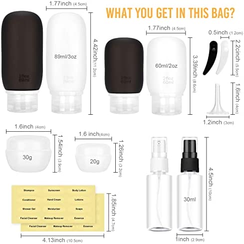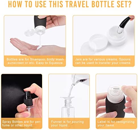 【TRAVEL ACCESSORIES FOR WOMEN MEN】Are you still struggled by taking big bottles of shampoo when you travel? Then these small and simple travel size bottles and containers can help you solve this problem. It comes with high quality upgraded zip bag + 4 Bottles + 2 Jars + 2 Spray Bottles + 2 Spoons + 1 Funnel + 2 Page Label. Believe us, it would be a convenient set for your vocations!