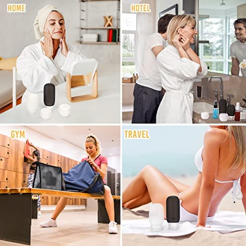 【SAFE SILICONE & SQUEEZABLE MATERIAL】 Made of Food Grade BPA Free Silicone, these travel shampoo bottles is sturdy, soft, flexible and reusable. Safe material guarantee that you can not only use them to store shampoo, conditioner, face soap, sunscreen, creams, lotion or etc, but also safe for food, various seasonings. Round soft body make you squeeze out contents easily.