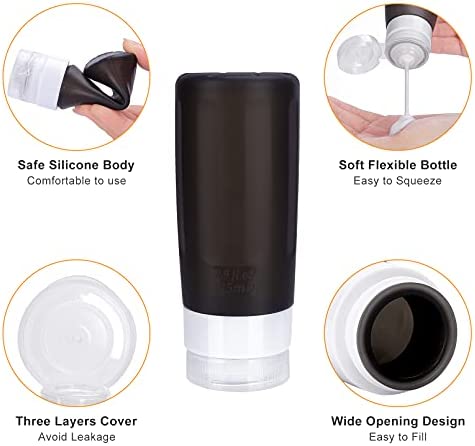 ♤【SAFE SILICONE MATERIAL】 Made of Food Grade BPA Free Silicone, this travel set is sturdy, soft, squeezable, flexible and reusable. Safe material guarantee that you can not only use them to store shampoo, conditioner, face soap, sunscreen, creams, lotion or etc, but also safe for food, various seasonings. Soft silicone body make you squeeze out contents easily