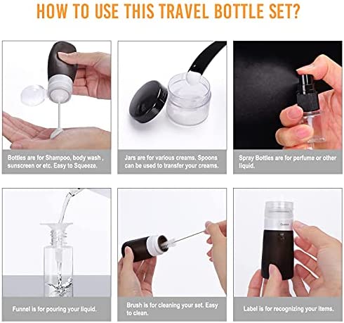 ☀【PORTABLE TRAVEL ACCESSORIES】Would you want to make your life simpler, more organized when traveling? Then this classic travel bottles set are the best and latest thing you should have. It comes with high quality upgraded zip bag + 4 Bottles + 4 Jars + 2 Spray Bottles + 2 Spoons + 1 Funnel + 1 Clean Brush + 1 Page Label. Believe us, it would be a fantastic set for your vocations
