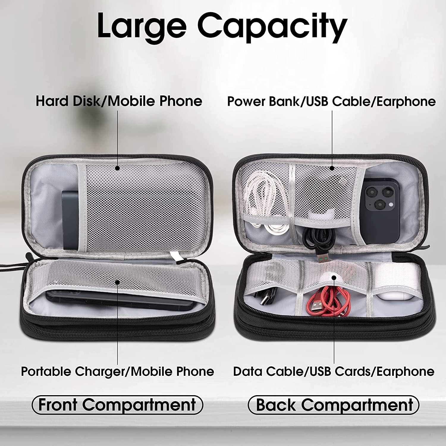 [Double Layers Design]-The electronics storage bag has 2 layers interior compartment with enough space to take in your cords, cables, USB drive, cellphone, charger, mouse, flash drive, and other accessories.