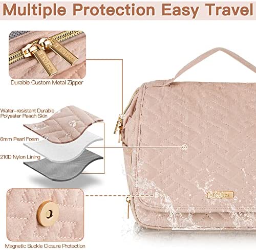 ✅ PREMIUM WATER-RESISTANT MATERIAL: The bathroom toiletry bag is made of high-quality water-resistant polyester with durable peach skin with supple touch; a 6mm well-padded design to keep the full bag’s shape. With sturdy stitching and custom metal zippers provide excellent protection for the toiletries bottles and skin care products in the bag. Stow-away swivel non-slip metal hook for versatile hanging options.