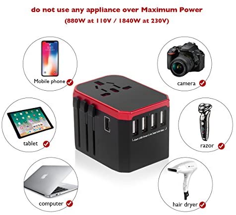 *ALL IN ONE INTERNATIONAL TRAVEL ADAPTER: 4 USB + 1 Type C large 5.6A fast charging , smart IC smart charging, intelligent matching used digital products, providing charging output. Type-C charging supports the charging of Iphone, IPad, Samsung Tab, Smartphones, Tablets, Bluetooth Speakers & Headset etc.