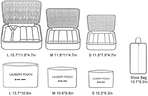3 Packing Cubes – Large (15.7″ x 11.8″ x 4.7″) Medium (11.8″ x 11″ x 4.7″) Small (11.8″ x 7.9″ x 4.7″)3 Laundry Pouch – Large (13.7″ x 10.6″) Medium (10.6″ x 9.8″) Small (10.2″ x 6.3″)1 Shoe Bag