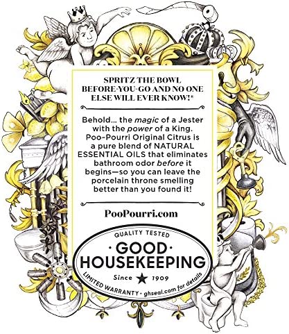 This Poo Pourri 2 oz. sprayer is the original formula of essential oils and other natural compounds that prevents bathroom odors before they begin! Just spray Poo Pourri into the bowl before-you-go, the proprietary formula creates a protective barrier on the water?s surface. This barrier is designed to trap unpleasant bathroom odors beneath the surface and keep them out of the air. All you?ll smell is a refreshing bouquet made from Bergamot, Lemongrass and Grapefruit! Each 2 oz. bottle can provide up to 100 uses. Measures 1.8″ l x 1.8″ w x 3″ h.