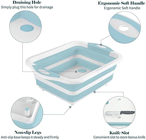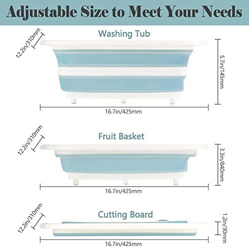 Rottogoon Collapsible Cutting Board, Foldable Chopping Board with Colander, Multifunctional Kitchen Vegetable Washing Basket Silicone Dish Tub for BBQ Prep/Picnic/Camping(Light Blue)