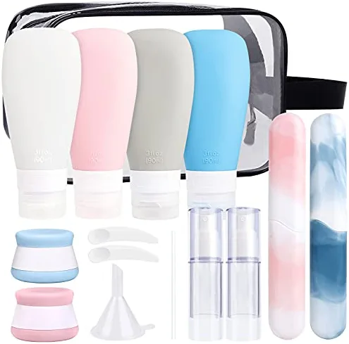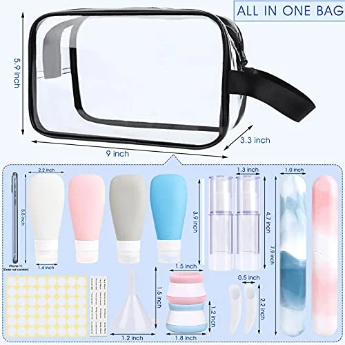 Portable Travel Campanion: INSFIT travel kit includes empty silicone bottles 3oz*4, silicone cream jars 20ml*2, vacuum spray bottles 30ml*2, portable toothbrush cases*2, clear toiletry bag*1, travel bottles stickers(16 labels)*1, white label sheet (48 labels)*1, funnel*1, spatula*2, white stick*1, different colors with stickers are convenient to distinguish what liquids inside. Our travel toiletries kit is perfect for your cruise travels, business trip etc.