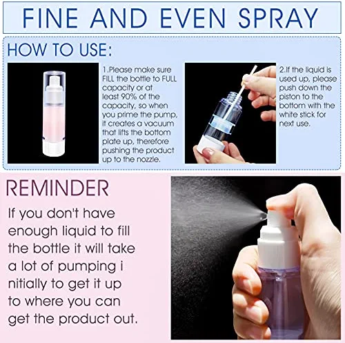 Leak Proof Travel Bottles & Jars: with three layers leak proof design it prevents liquid leakage or spillage, offers protection to your luggage and cloths without making a mess.Our airless vacuum face mist spray bottles are leak proof too due to the vacuum dispensing effect. Please check the instruction manual packed about how to use our travel accessories for airplane set correctly.