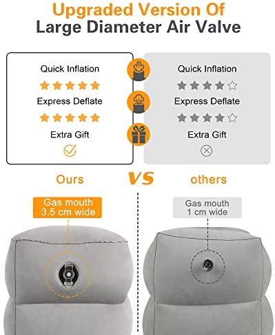 Very User-Friendly Design: Our inflatable foot rest pillow with 2-in-1 double valve,the upper black air valve is a one-way air inlet for inflating or replenishing gas.bottom transparent air valve can be quickly inflated and deflated,when you are done blowing it up, push clear cover on and push whole valve in so that it is flush with the side of the travel foot pillow,the airplane footrest takes away the hassle of bringing a pump and making noise in flight.