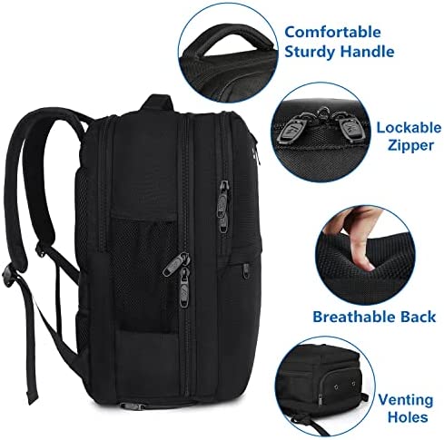 DURABLE MATERIAL: The mens backpack is well made of Water-Repellent and Durable Nylon Fabric with metal zippers;There has Lockable Metal Zippers in laptop pocket to protect your computer or valuables from thieves (you need to lock up laptop compartment with your own lock); Foam padded top handle is comfortable to carry on for a long time