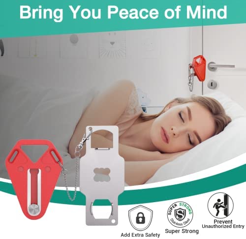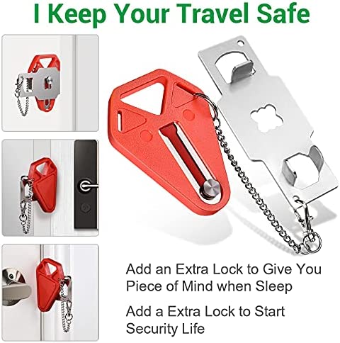 EASY TO USE & SAFER DESIGN: No need to nail or screw into anything, just put the medal part goes into the hole on the door jam then you close the door, take the red handle and insert it into the lock in place, then no one could get in and in case of an emergency you could remove the lock in seconds in the dark! Add a portable door lock to provide you with a strong sense of safety.