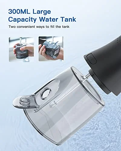 [300ML Large Capacity Water Tank && IPX7 Waterproof.] 300ml water reservoir perfect for enough and uninterrupted water dental pick teeth cleaner without filling in water again and again. Due to the open tank and detachable design, this water flosser much easier to clean inside of the water flosser tank. Enjoy the convenience of cordless water flosser and the water-resistant of this model up to IPX7! You may also safely use the water flosser in the bath or shower.