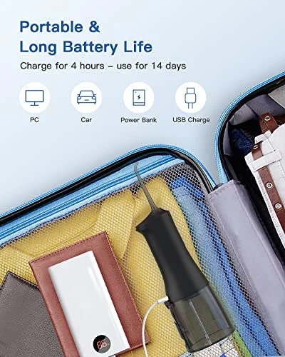 [Powerful Long battery life with USB cable charger.(Charging adapter not included.)] The USB rechargeable water dental flosser will last up to 14 days continuous use after one fully charged in just 4 hours, with a powerful battery life to ease power anxiety. The water flosser is portable and suitable for taking with you anywhere you travel. The water flosser is compatible with any charger or equipment with a USB port, such as power bank, computer, laptop.